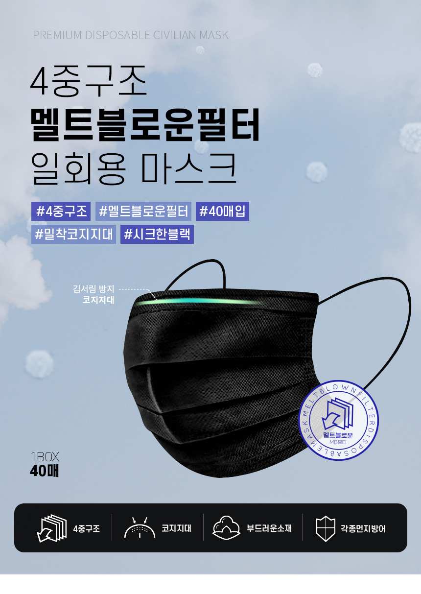 4중 구조의 멜트블로운필터가 들어간 일회용 마스크이며 김서림 방지 코지지대까지 있어서